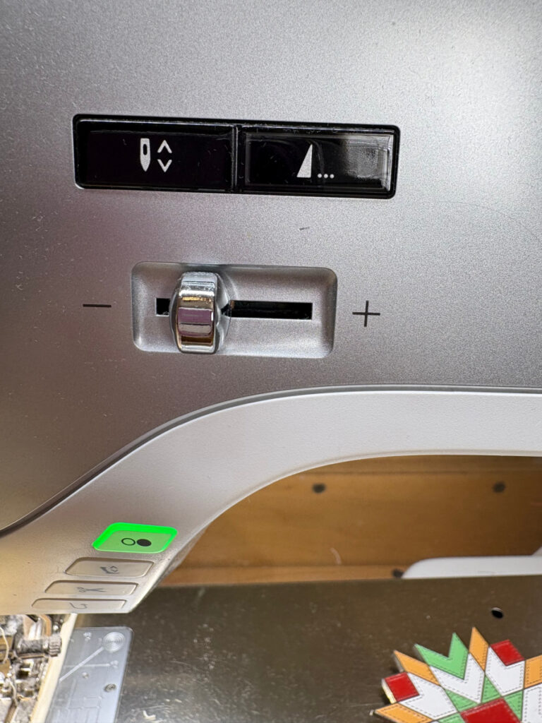 There were two machine adjustments that helped my stitching come out more even and precise. One, as you see in the photo above, I moved my stitching speed to slow. S.L.O.W. That is my strongest recommendation: go super slowly.