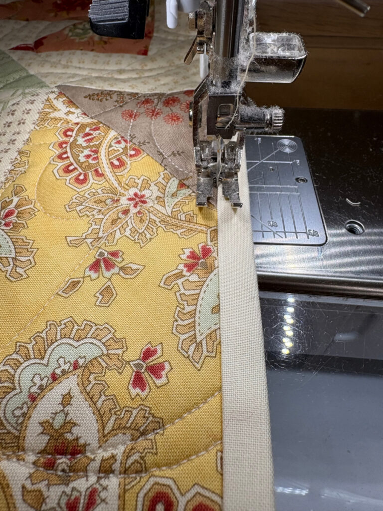 I started my machine-binding journey slowly, with smaller projects like coffee mugs, then moved on to table toppers and runners. Then I tackled a couple of small quilts, and finally graduated to stitching full-sized quilt bindings on my machine. It has been a real game-changer. Now my quilts actually get finished and don’t hang around for a year waiting for me to bite the bullet and sew those bindings on by hand. I know a lot of you are going to tell me how much you love sitting in the evenings by the TV and doing your handwork, and that is fabulous. My eyes aren’t so good anymore, though, and sitting in anything but the brightest (even outdoor) light is the only way I can do good handwork. And frankly, I don’t really enjoy it. I am so glad I forced myself to try something new, and now I love machine binding all my quilts.