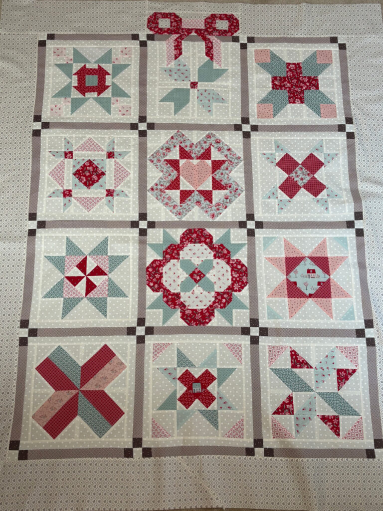 FYI, the two center blocks were two that I made for the original intention of this quilt. It was supposed to be the 2024 Designer Mystery Quilt from the Fat Quarter Shop. As the quilt was coming together, I realized it just wasn’t my style. I liked the fabric collection, which is Bunny Hill’s “My Summer House”, however and wanted to use it. When I saw what Erica was doing, I subbed the two blocks I had made for two of her monthly blocks and just carried along with her sew-along.