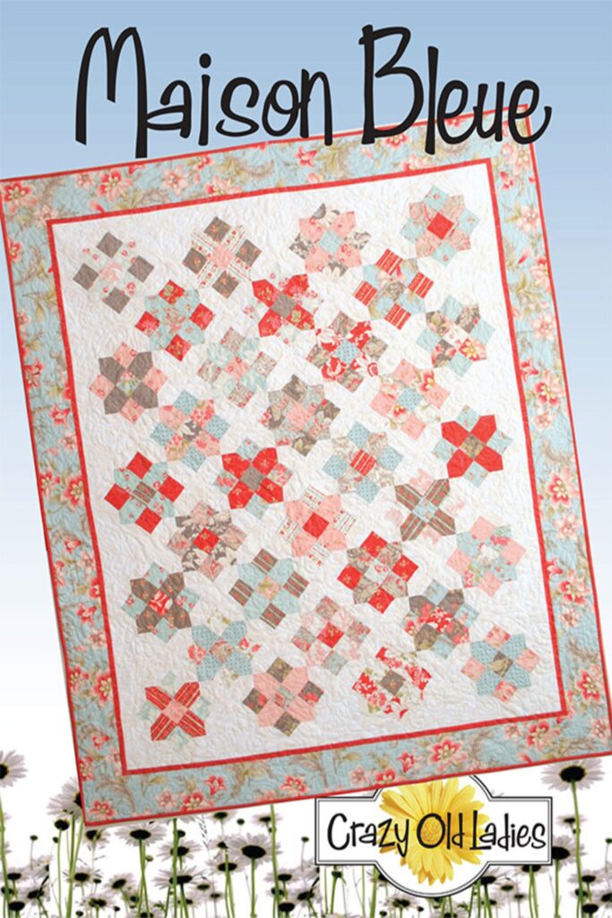 I have some great news! A couple of you inquired about the pattern I used for my Maison Bleue quilt, which didn’t seem to be available anymore. (I told you I had started it years ago!). Anyway, I contacted Emily Herrick, the owner of The Crazy Old Ladies pattern company, to ask about the pattern’s availability. She very graciously added the pattern to her Etsy site, so you can get it if you are interested. This is a rather unusual block, not at all hard to make, but quite different from what you usually see. It would look terrific in just about any fabric collection, and best of all, it can be made with a layer cake!!!! I highly recommend you pick up the pattern from Emily because it is not available anywhere else.