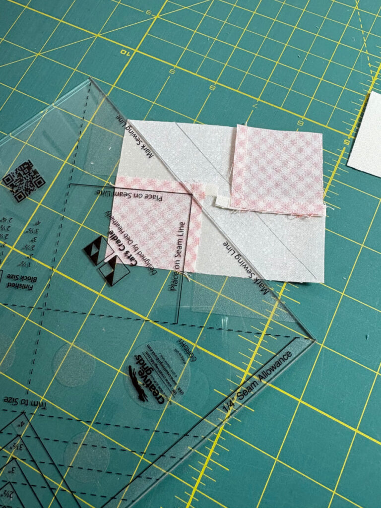 I have a special tool from Creative Grids called Cat’s Cradle, which helps a lot. That said, I have never tried to make such microscopic units. The ruler served me well, and I made the smallest version offered, which is for 1 1/2″ finished Cat’s Cradle blocks. Each block in the quilt pattern calls for four units, and you need to make two blocks. So eight of these tiny units total.