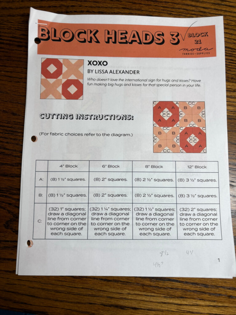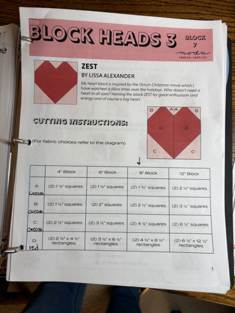 I knew I wanted one of the quadrants to be a heart, and that was easy. In the same binder, there was a pattern for an 8-inch finished heart that worked perfectly. These patterns are all still free and online in the Moda BlockHeads archives on their website.
