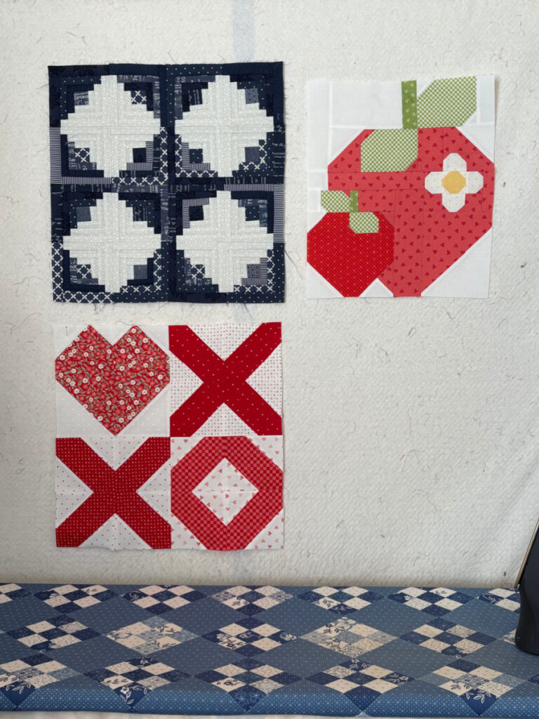 I was so delighted with the results of the navy and white log cabin blocks that I pulled out some Lella Boutique Valentine fabric (Love In Bloom) and tried to recreate a Moda BlockHeads 3-block pattern that I had in a binder.