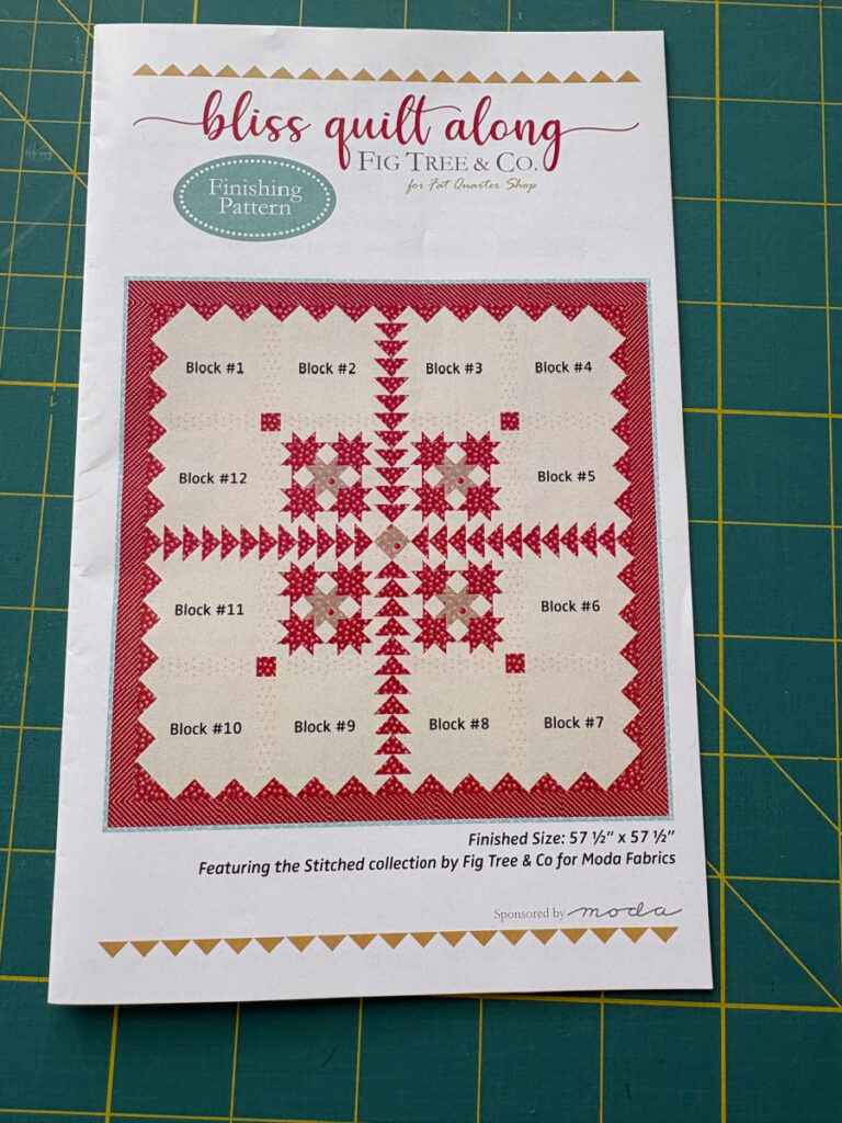 Bliss was a Fig Tree pattern that you could only get if you subscribed to the FQS Sew Sampler box, which I didn’t. After the year is over, FQS releases the pattern cards for sale in a bundle. They are pricey, but I really liked the fabric and the setting so I bought the cards. I am really glad I did because I am enjoying sewing the blocks so much. I am going to start on the flying geese for the setting pretty soon.