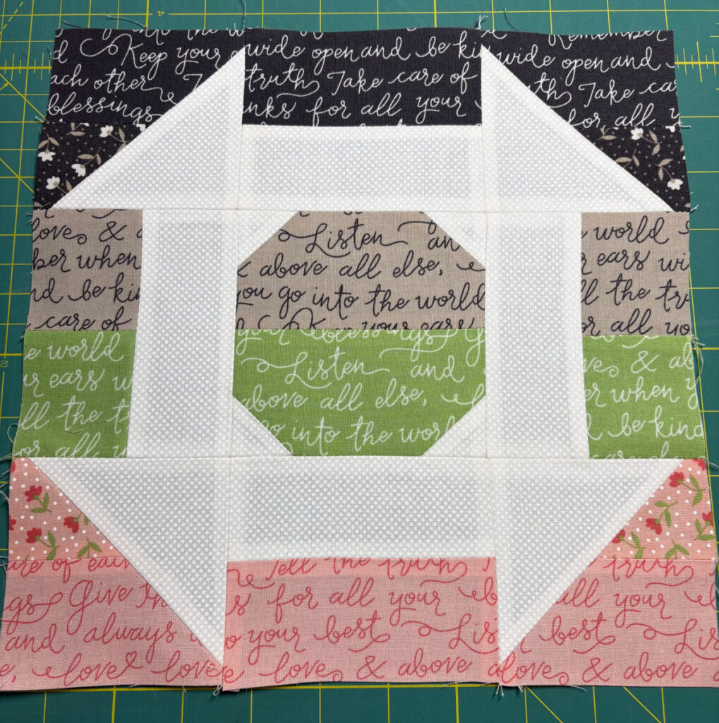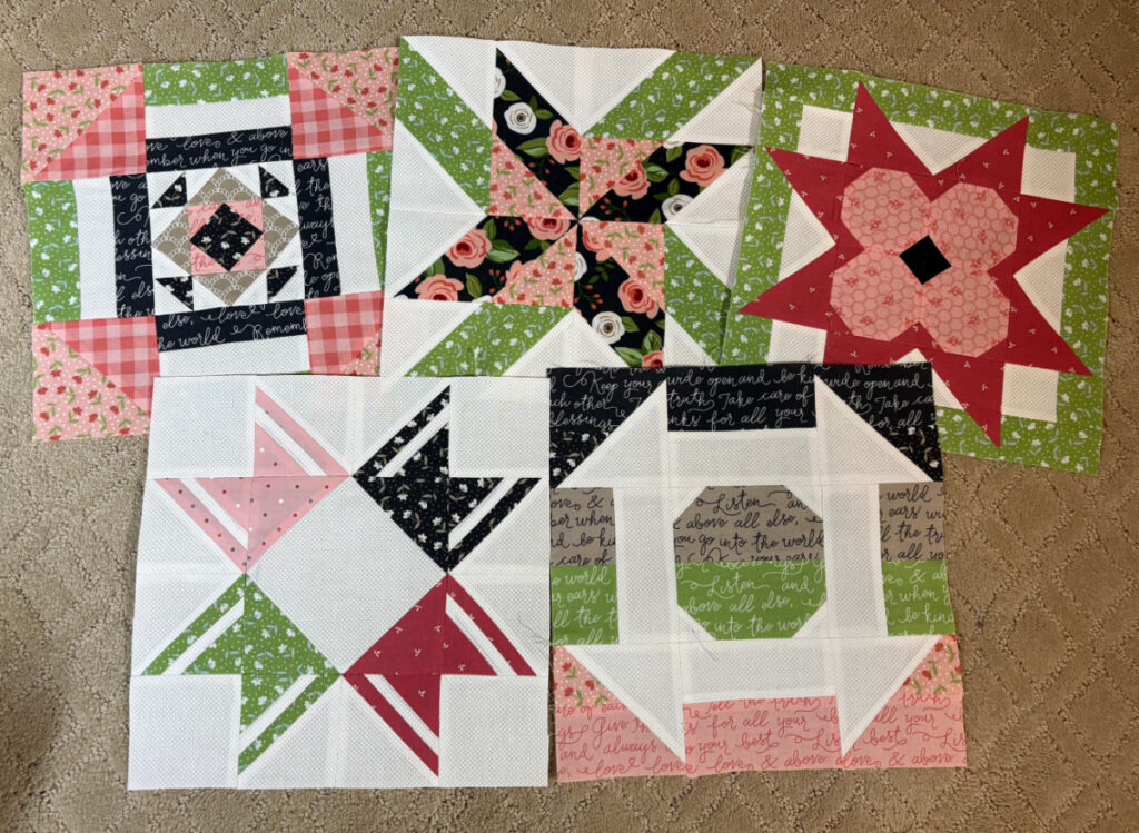 1. The blocks are more challenging than most sew alongs and I think more interesting as well. Another benefit is that they have done this program since 2021 I believe, and all those patterns are still available on their website and could be interchanged with the current sew along. All the block sizes are 10″ finished.