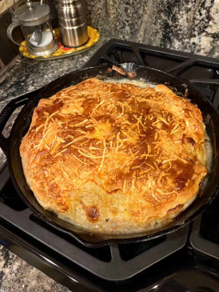 Saturday night, I made a chicken/mushroom/leek pie, and it was fabulous. You could do it with rotisserie chicken, and it would be even easier, but I had a couple of chicken breasts that I poached myself. The entire recipe is made in a cast-iron skillet, so clean up is a breeze. You sauté chopped leeks, celery, mushrooms, and garlic in butter and oil, then sprinkle in flour to thicken. Add the chicken back in, along with some broth, and cook it just until the sauce makes a gravy. I used Italian herbs, salt, and pepper to season things. Turn off the heat and add a bit of half and half and some lemon zest. Let things cool, and when you are a half hour from serving, top it with a trimmed-up Pepperidge Farm puff pastry sheet and some egg wash and Parmesan cheese. Pop it in the oven for 25 minutes or so, and you will have a fantastic, gourmet, restaurant-quality dinner. Here is the recipe. Make it. Another win.
