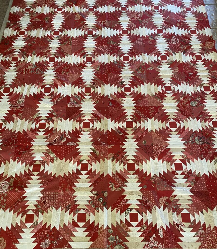 This is my Red Pineapple quilt, finished back in 2021. The ruler I used was tricky to position, and my points didn’t always match up the way I would have liked them to. I recommend the Creative Grids Pineapple ruler over whatever other one I used here. I don’t recall what it was, and believe I may have discarded it.