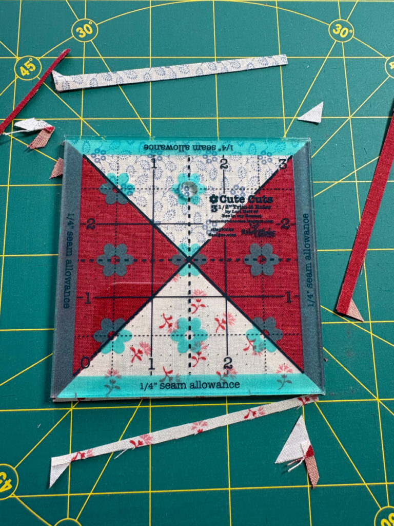 Lori Holt’s Cute Cuts trim tools are invaluable for getting an hourglass block trimmed up perfectly. They come in multiple sizes and I have splurged on a number of them.