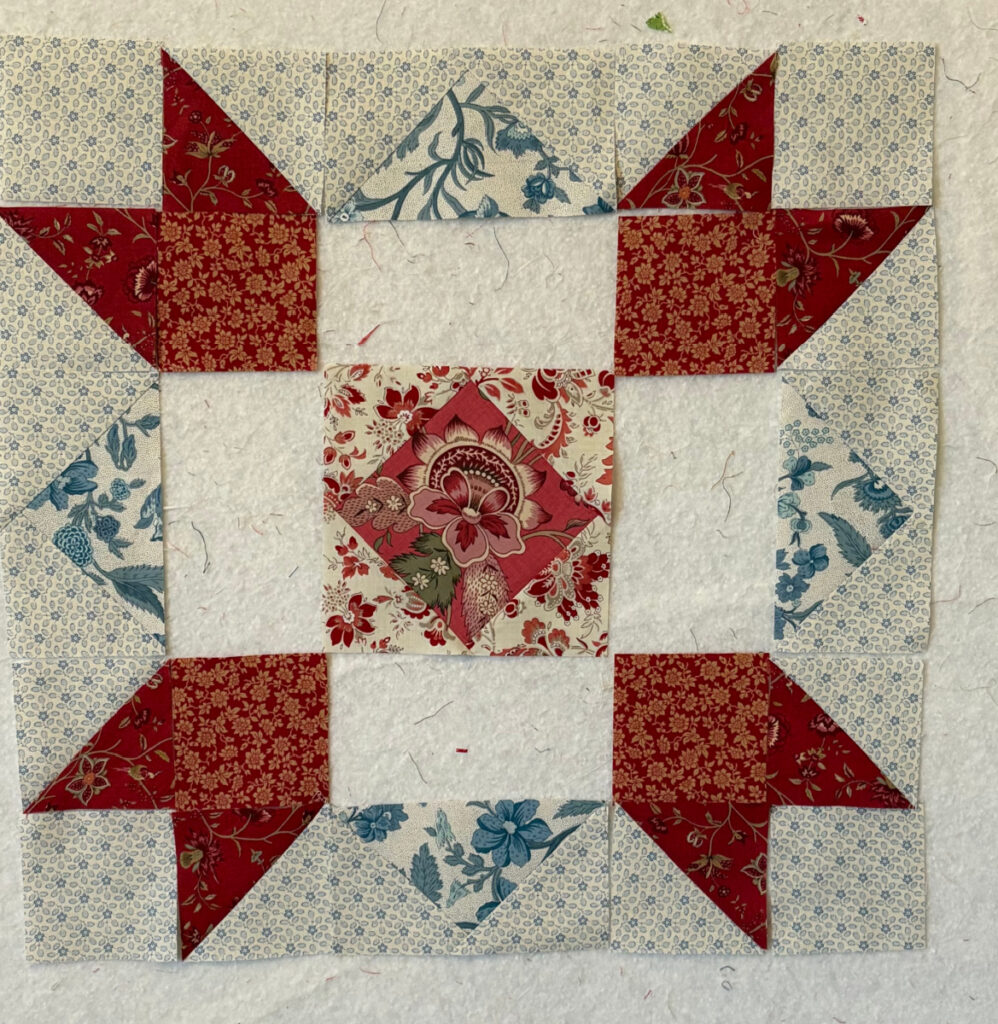 For my medallion quilt, I want a center medallion, obviously. I have been thinking that if I do nine-inch blocks, I could work with an 18-inch center medallion. I found a pattern I liked, but the largest it came in was nine inches. You have to do math to increase a block size. Not my strongest aptitude. I am tackling it section by section, and it’s going well.