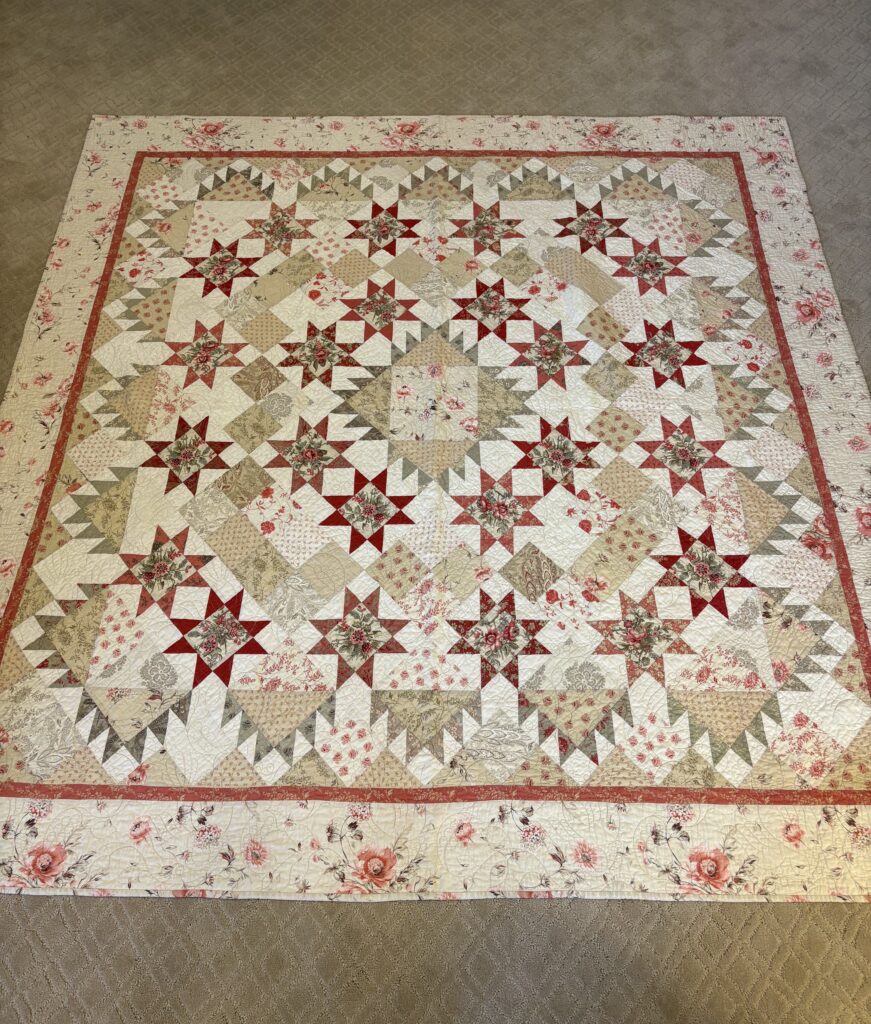This is funny. I pulled this quilt out of the piles on my closet shelves, laid it out, and took a picture before I realized that it isn’t made with French General fabric at all. It was made with a collection called Cinnaberry by 3 Sisters. If it isn’t a dupe for French General, I don’t know what is. You could absolutely achieve the same look with FG fabrics. I don’t think the pattern is widely available, but I did find one on eBay.
