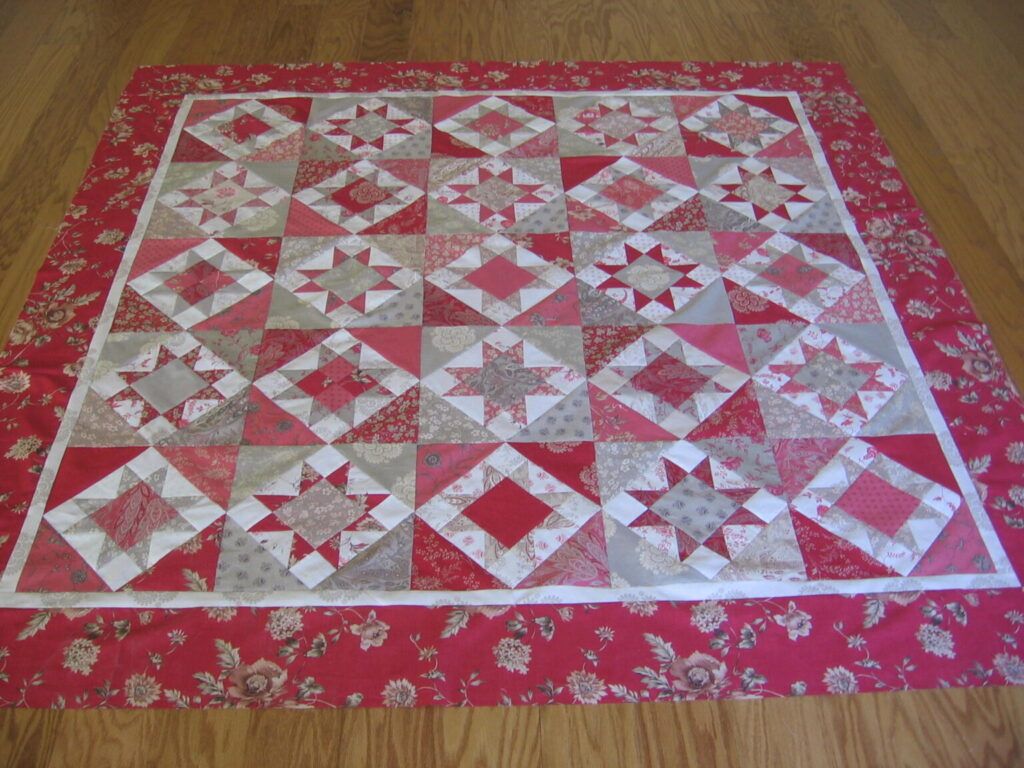 There is a funny story behind this quilt. Carrie Nelson of Miss Rosie’s Quilt Company designed a small table-topper-size quilt called Madeline (one of her Schnibbles patterns), and my friend Thelma (Cupcakes’n’Daisies) wanted to make a full-size version. We enlarged the blocks, and here’s what I came up with. Thelma’s quilt was better because she also made the smaller tabletop version and used it as a center medallion in her quilt. Click on the link and go look at hers, it is spectacular (as are all of her quilts).
