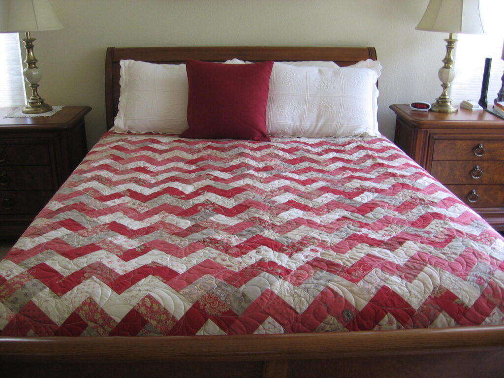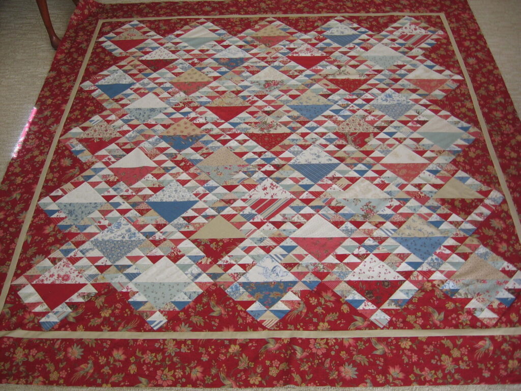 I must have given this quilt to someone. Whoever it was, I hope you are enjoying it. The good news is that this is a free pattern on the Moda website. You could have your own French General quilt in no time with this free, easy pattern. You just make a bunch of red strips, cut them with the triangle ruler and alternate them with solid triangles of tan in each row.