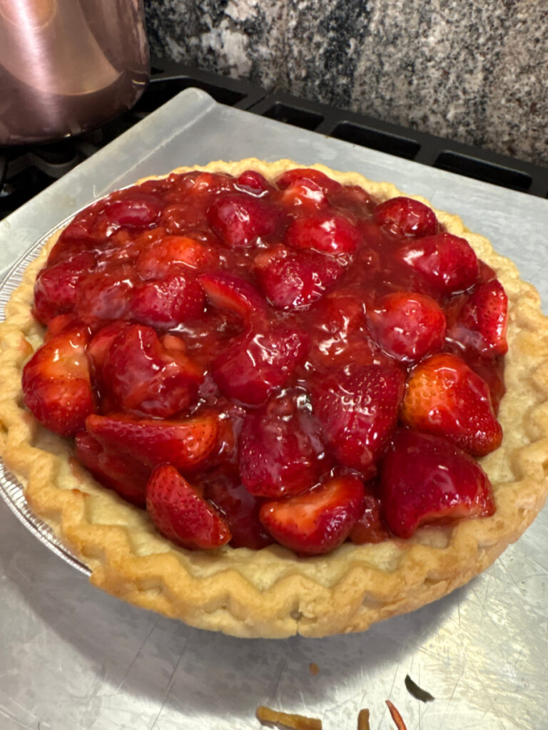 Dennis and I attended a family dinner on Saturday night, and I volunteered to bring dessert. Dennis helped me make this beautiful strawberry pie in the photo above. It is a recipe by the Pioneer Woman, and it was easy to make (if you follow the directions) and was so delicious. However, after I had made it, my son-in-law mentioned that there were going to be 13 people attending the dinner….Ok, I needed another dessert. I had another prebaked pie crust, so I made the Pioneer Woman’s Chocolate Pie recipe.