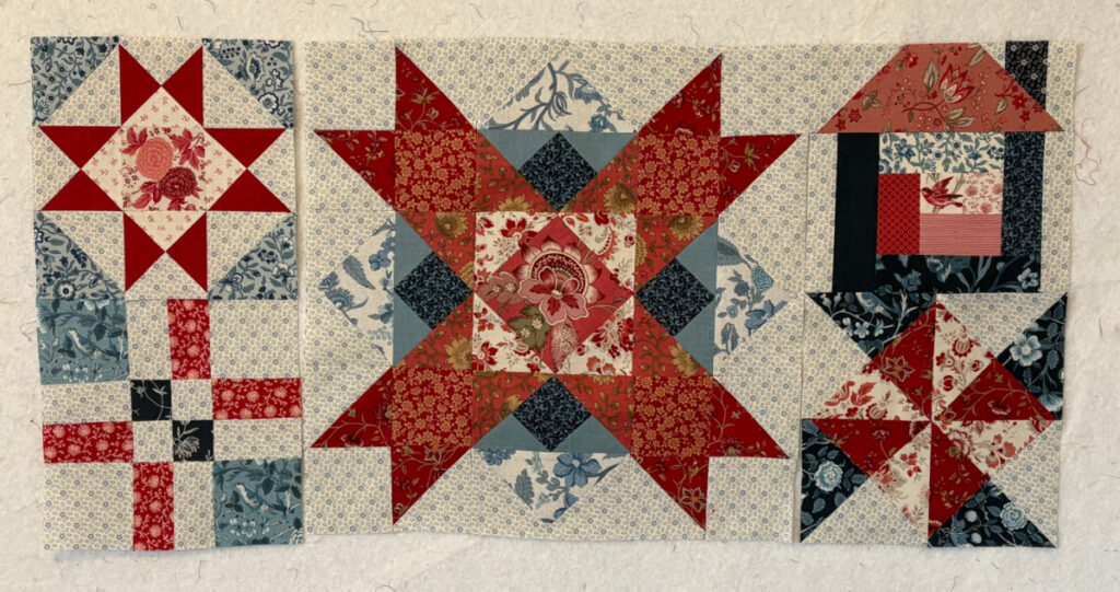These are the blocks I have made so far. The smaller ones are Sewcialites 1-4. I am not sure of my setting this point, so if I go with a diagonal set, that cute house block won’t fit in. I will just take it a week at a time and see how things evolve. It sure is fun playing with all these patterns!