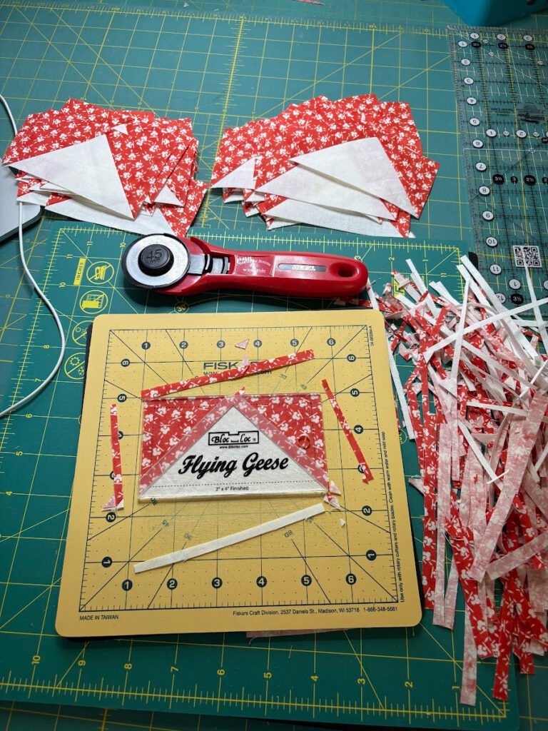 The trim pile from your flying geese looks very satisfying! Finishing 48 of them is a huge accomplishment! Safe travels to & from your eye appointment.
