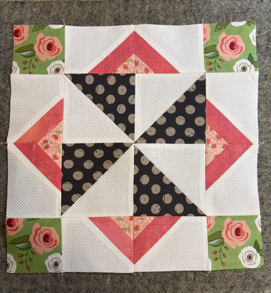 This is Block 11, Pinwheel Pop, designed by Amanda Niederhauser for Riley Blake. I think it is innovative and interesting to look at.