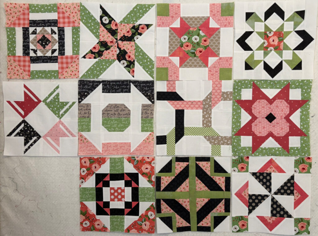 Just a quick post today to show that I wasn’t a complete lazy bones over the weekend. I got all caught up with my Riley Blake Challenge blocks, 1-11. These blocks have indeed been challenging and great fun to see come together.