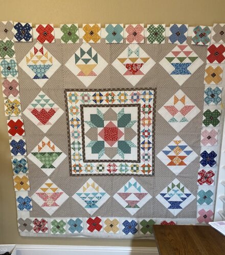 The posie blocks are finally finished, all 40 of them. I slapped them up on the design wall so you can get an idea of what it will look like. Two narrow borders need to go on first, a dark brown one and a white one. We are getting there. My Mercantile background fabric arrived […]