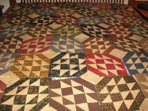 Now, these blocks are not sewn together, just laid out on the design bed, but you can see how this top is coming together! Don't the blocks make a cool design when rotated the way they are? The pattern and fabric was a kit I bought from Bonnie Blue Quilts, a shop specializing in reproduction […]