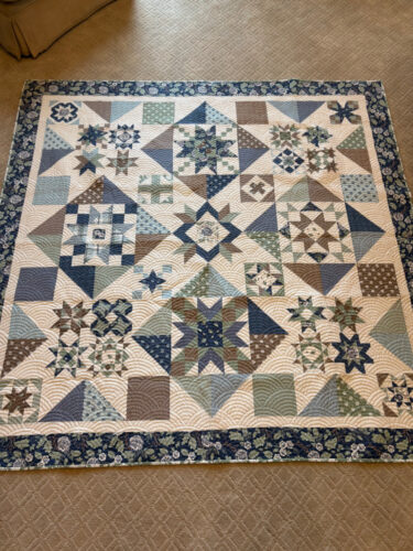 At my Banish the UFO’s sewing group yesterday, a couple of my friends held up the finished Hour a Day quilt so I could take a picture. Sorry for the tables and machines in the foreground–they couldn’t get back any further. The finished quilt has kind of a Mackenzie-Childs look to it, don’t you agree?